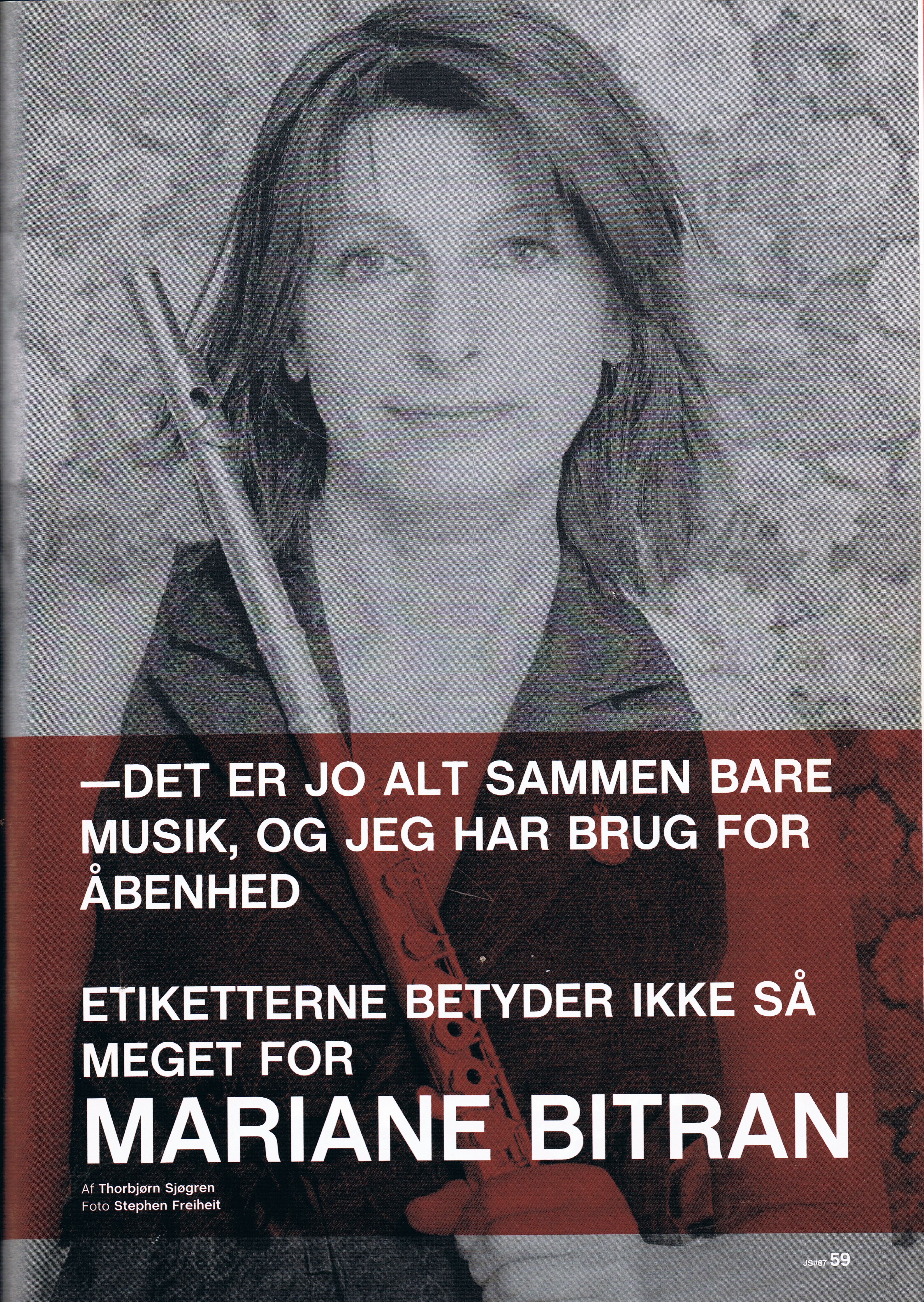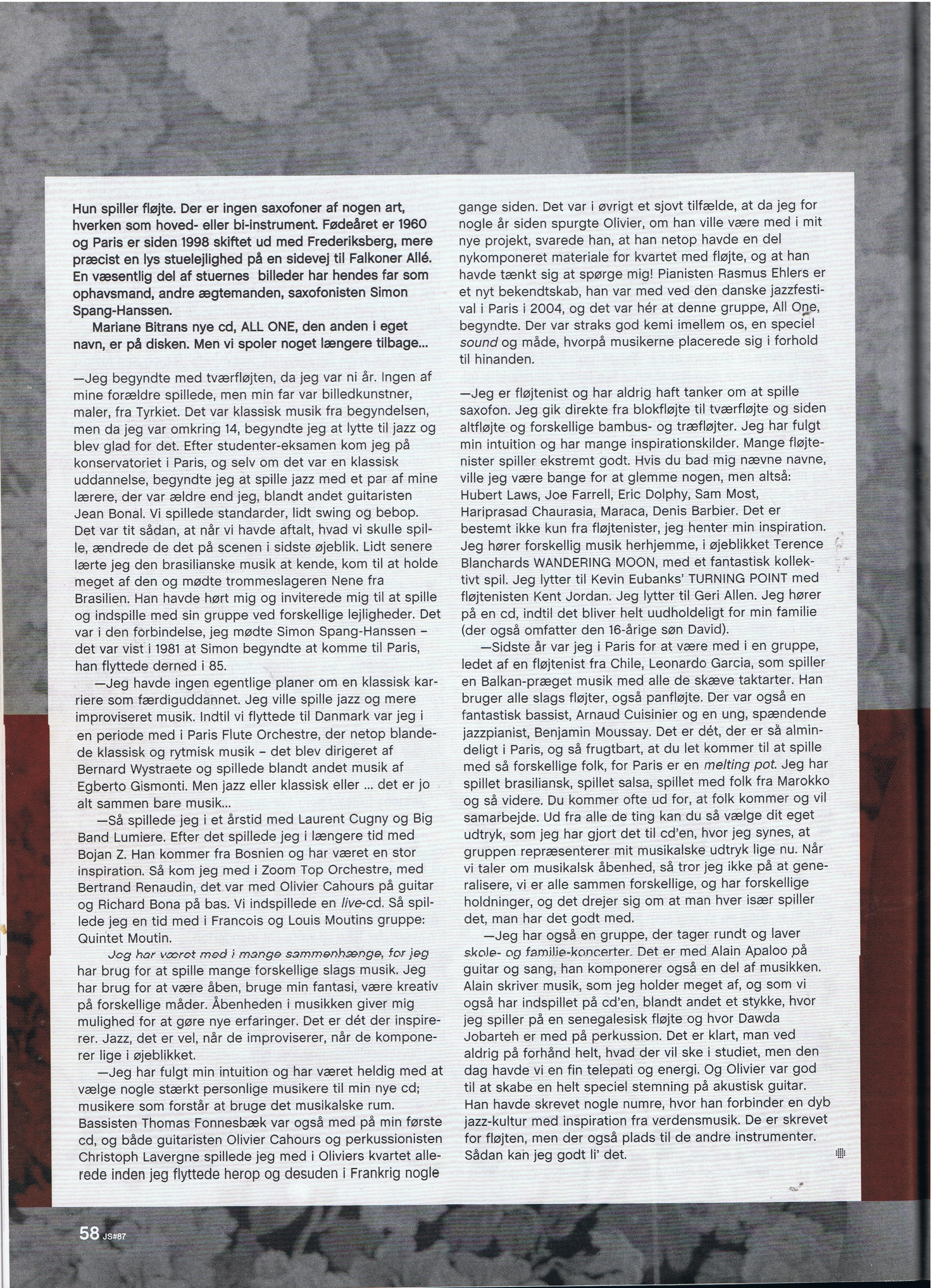 « The French flutist, Mariane Bitran, who lives in Denmark, that made her debut this evening with her own quartet, immediately showed a brilliant control of her instrument. Her tone rows floated away with ample melodiousness, as did the music she made, using her good and relatively classical sound, excellent improvised statements in which late jazz flute expressionists like Eric Dolphy and Roland Kirk – occasionally-would seem to lurk somewhere in the depths. »