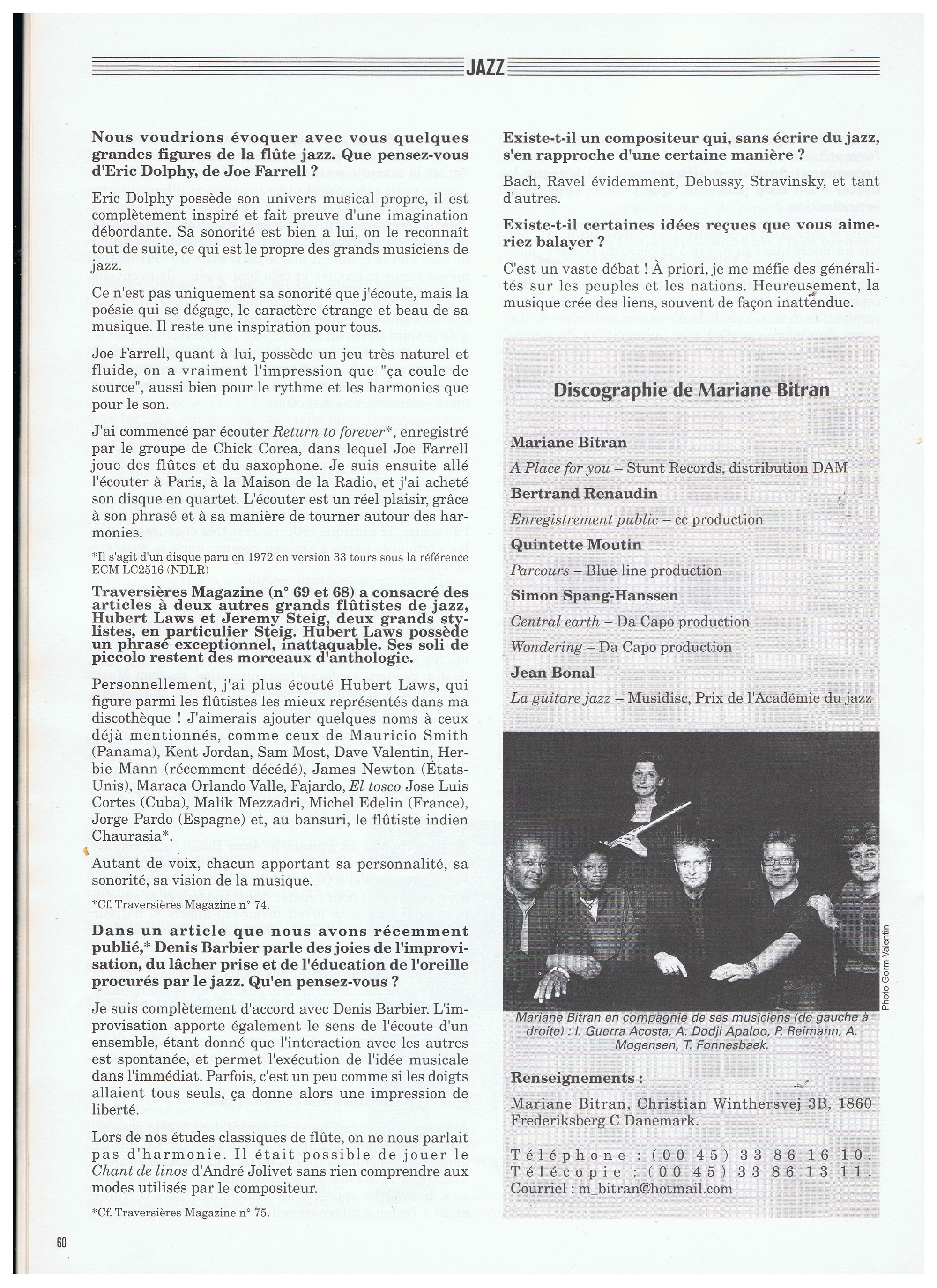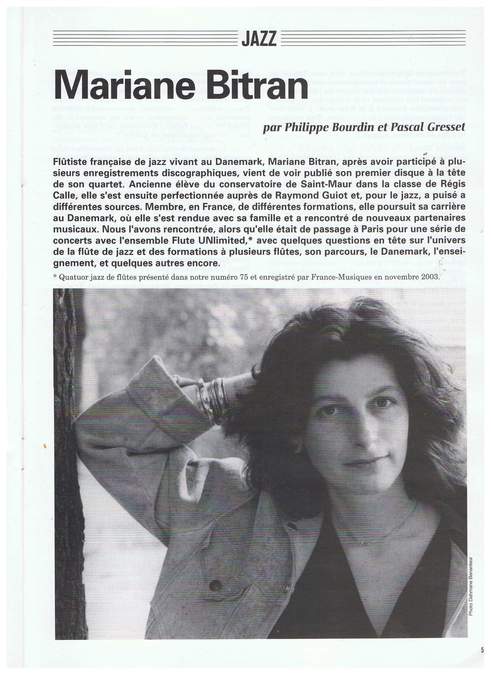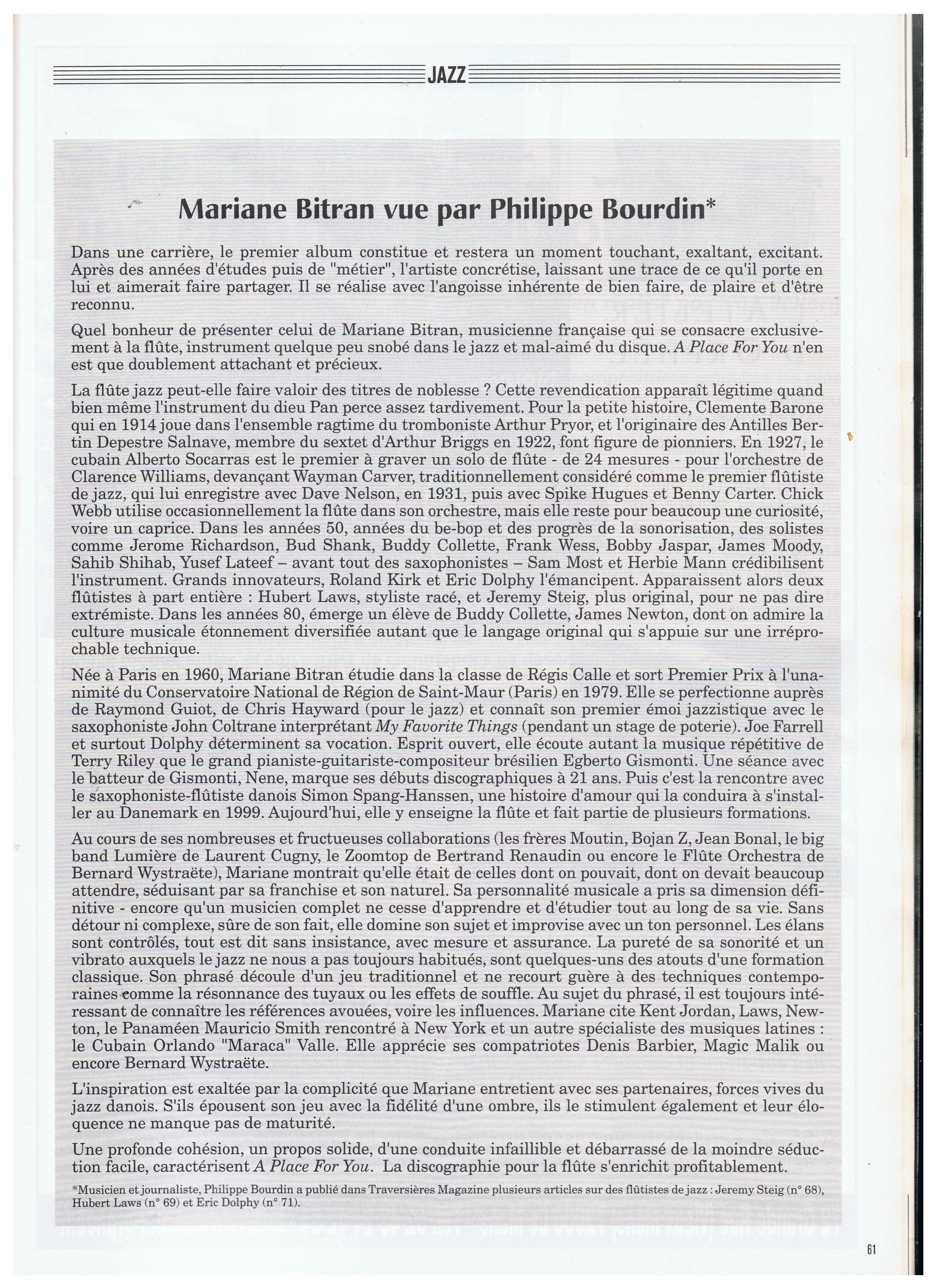« French flutist, Mariane Bitran, from Paris was definitely a good acquaintance. She expressed herself with elegance and an unusually beautifull tone, not unlike her famous compatriot Jean-Pierre Rampal, and at the same time she possessed a reel and progressive imagination in the jazz idiom. »